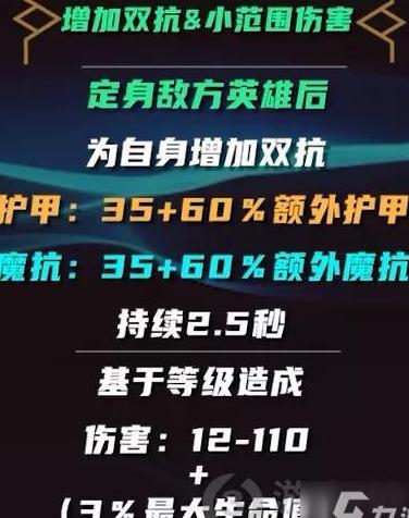 自身增加2护甲和5魔抗,附近队友获得5护甲和2魔抗。