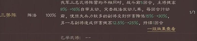 三势阵战法虽牺牲国家队10%属性,却显著提升战法发动概率,并增强减伤与增伤效果,适合爆发型队伍使用,不仅强化输出能力,还大幅提高阵容搭配的灵活性与战术多样性。