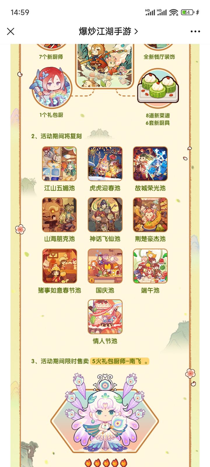 国庆池中有剧本池,有兴趣的可以抽一发,拿个手指饼干给1级厨师修炼。肉蟹煲作为符文菜加修炼菜还不错,但目前抽卡没有折扣,性价比不高,可以等周年活动再考虑。