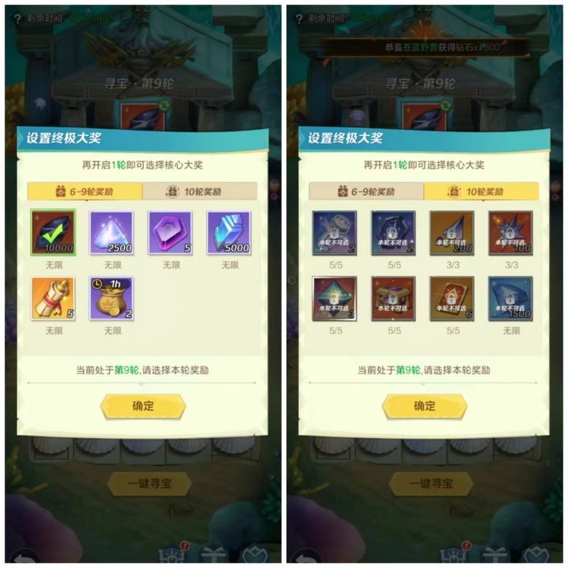 寻宝策略说明:每一层可开启的奖励分为1珍珠、2珍珠、5珍珠以及进入下一层的选项。其中,5珍珠的格子每层固定为5个。是否进入下一层应根据当前获得的珍珠数量以及已消耗的海洋之心比例来判断,只有当该比例达到或超过2.1时,才能确保最终累积到420珍珠,并至少两次领取1500钻石奖励。整个活动全程最多需投入11000钻石。本次活动性价比非常高。请务必按照策略操作,避免因珍珠不足而无法完成目标,若因贪图层数导致珍珠短缺,最终影响奖励的,请勿发帖抱怨,以免贻笑大方。