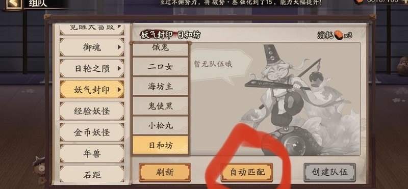 日和坊的妖气被封印于组队界面,探索时亦有几率自行发现。