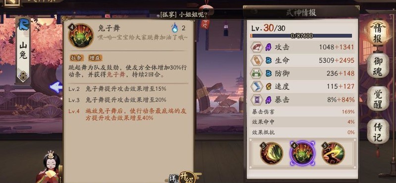 山兔需觉醒且二技能满级,御魂二号位佩戴速度,作为拉条式神必备。