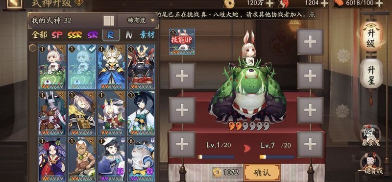 R卡和SR卡式神升级技能时需同类型吞噬,切勿使用黑蛋喂养。