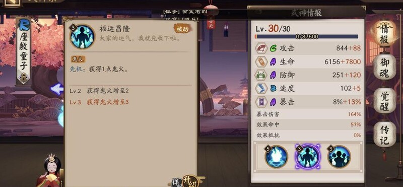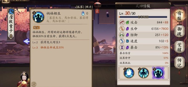 座敷童子,火属性式神,技能全满,佩戴火灵四件套御魂,已觉醒。