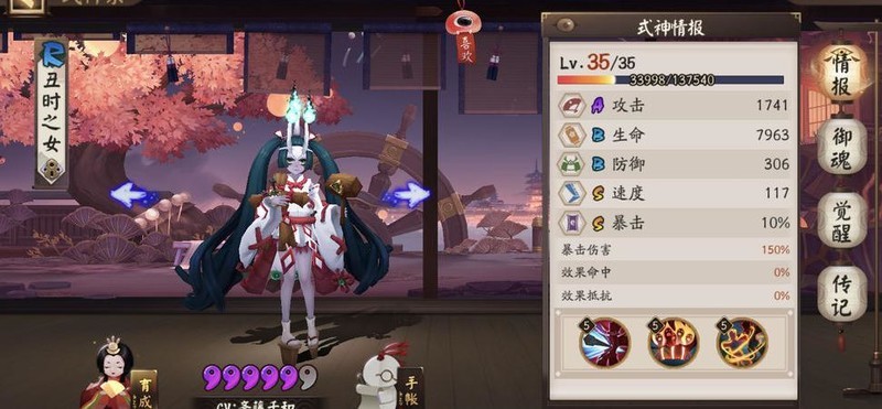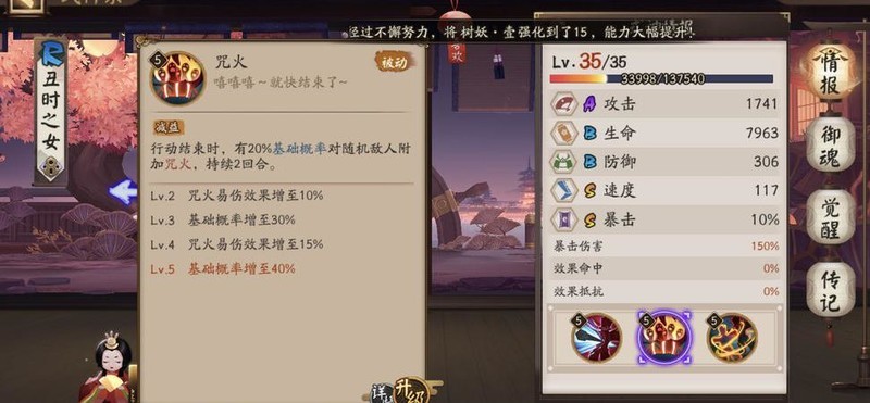 丑时之女建议技能尽量升满,御魂搭配狂骨、破势或心眼四件套,外加荒骷髅两件套。