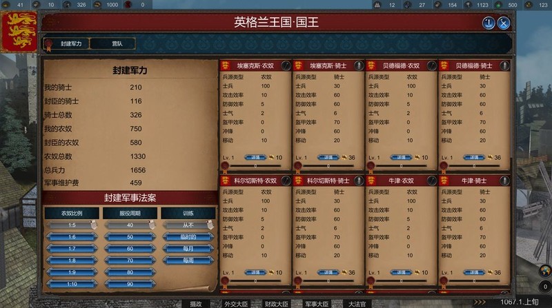 每个领主的直属封地都配有两支封建军队,一支是骑士部队,另一支则是农奴部队。农奴部队的具体人数由封地内骑士的数量以及相关的农奴服役法规决定。游戏开始时通常是一名骑士带领五名农奴参战,调整服役法规后最多可提升至十人。某些文化或国家的特殊加成还能进一步增加这一数值。每支部队在战场上都是独立作战单位。