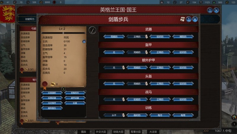 玩家可以为常备营队设置不同的图标以作区分,并自定义营队的名称。常备营队每月会在所属封地内招募士兵,每支营队每月最多可招募10人。一旦招募成功,这些人口将从封地中移除,并相应减少粮食和税收收入。通过提升士兵容纳上限,可增加营队数量,最多可升级至5级。在和平时期,常备营队的维护费用为显示金额的一半,与税收一样,按季度扣除。然而一旦进入战争状态,维护费用则改为每月支付。若资金不足,营队将停止招募新兵,原有士兵也会离开军队,返回封地恢复生产活动。