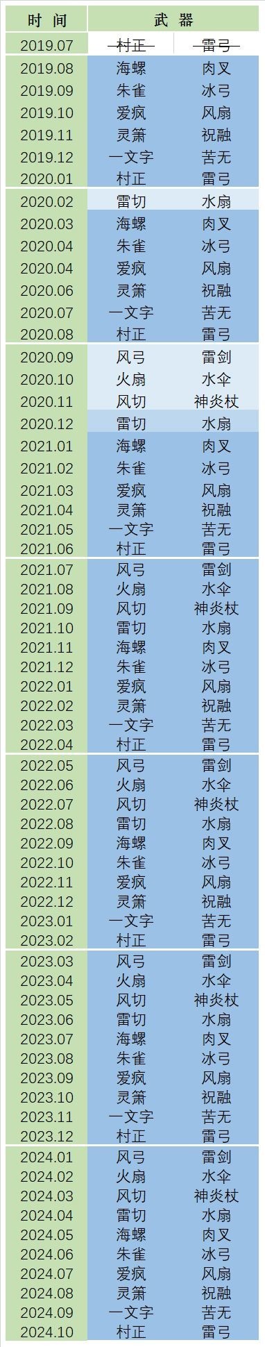 目前仍未新增武器,考虑到这一情况,现决定将1至10月的内容一并公布。若未来仍未更新,则将依照此表顺序进行轮换。