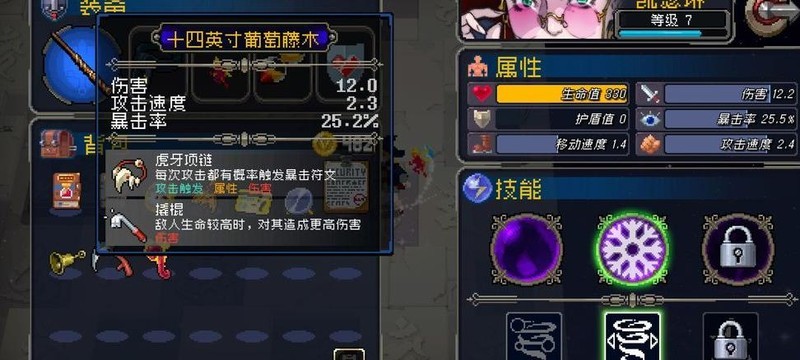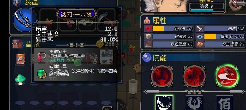 主要技能详见上方图示,初期推荐选择附带闪电效果的次要技能,搭配多段伤害技能可平稳过渡前期。中期核心装备为镰刀,通过刷血维持生存能力,确保后期不被瞬间击杀。次要装备可选用陨石类,如灵魂镣铐,配合召唤史莱姆提升持续输出与最大生命值。若条件允许,建议加入吸血獠牙以增强回复能力,因后期续航仍依赖其核心作用。其余配件可根据个人习惯自由搭配,我自身选择了虎牙项链、沙漏与护盾转换,实现无冷却并配合绿色瀑布特效维持血量。若担心暴毙,可将护盾替换为缓冲护甲。六道之力方面目前仅解锁天人道禅悟,故暂用此配置。