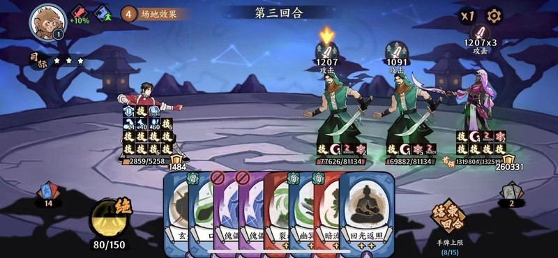 另一套打法是开局刷免疫帽加正气决,防止被禁足,争取在第三回合打出能秒小怪的毒。传毒的折梅手不要省,1.5倍的技能也不要省,后面的毒量会溢出,这样打起来就轻松了。之后依靠逍遥的被动回收小怪留下的毒,每个回合都要留一张传毒在手上,避免断毒导致小怪清不掉。
