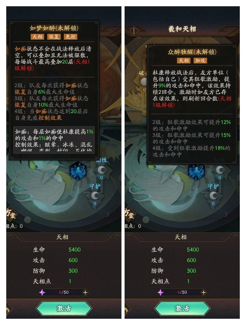觉醒·狂舞:杜康起舞令敌人斗志衰退,普攻命中后可驱散敌方随机增益,战斗初期降低敌方全体伤害与暴击效果。
