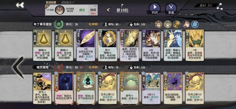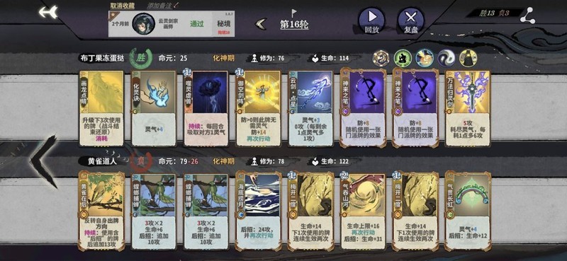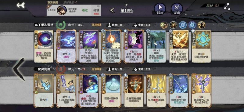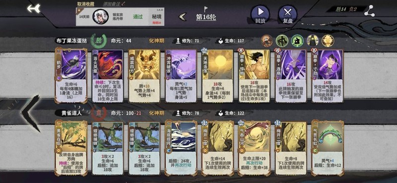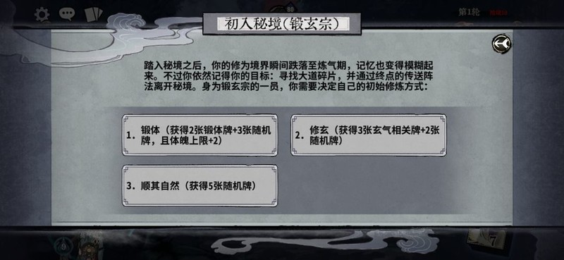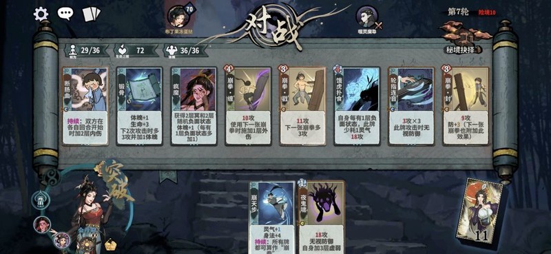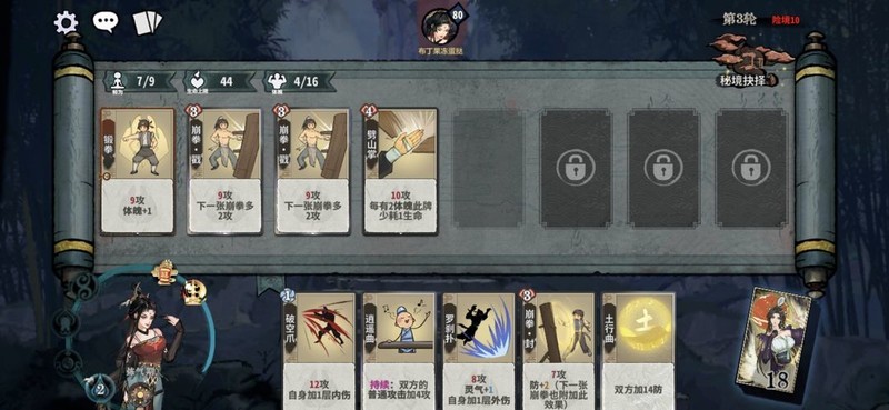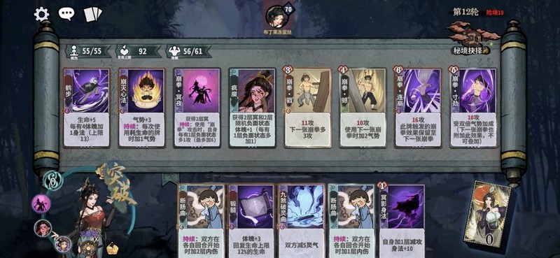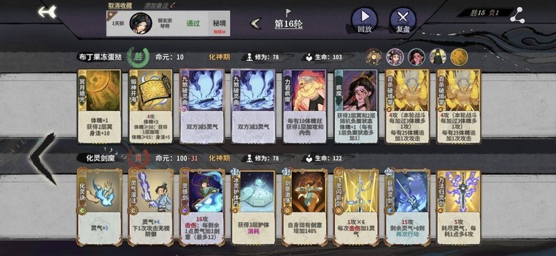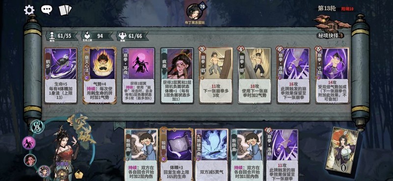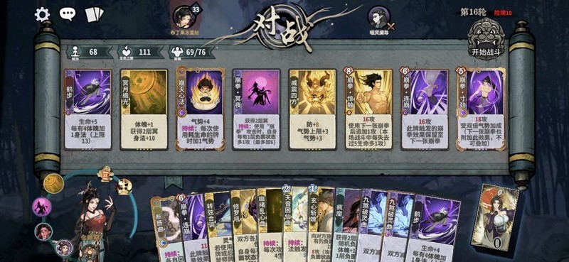 第三局只要牌运正常通常都能过,实在赢不了就跳过,别强行打,留着牌。第四轮开始会出现道韵(秘境中可以用打牌次数刷新),我选的是崩拳惊触,这把主攻崩拳。首次突破仙命随便选一个就行,秘境不像天梯,不用刻意抢修为。