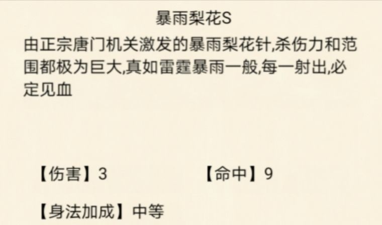 暴雨梨花S是暴雨梨花的强化版本,释放时共打出13枚暗器,基础伤害不错,且每次命中可附加1层普通毒,持续5回合。中毒状态下每回合会损失气血,该伤害无视目标防御,但与五毒、金蛇的中毒效果不同,无法触发毒爆。此外,中毒状态可通过狮子吼技能清除。
