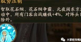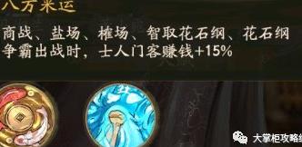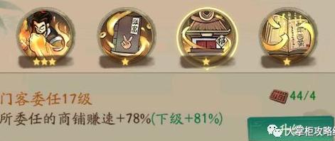 门客的副业大多相同,唯最后一个例外。首个技能财源广进可提升所管理商铺的收益速度,按百分比增加盈利效率。