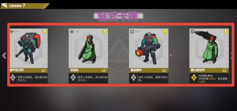 基地在1、2级时,可从4张轻武兵种卡牌中任选一张。
