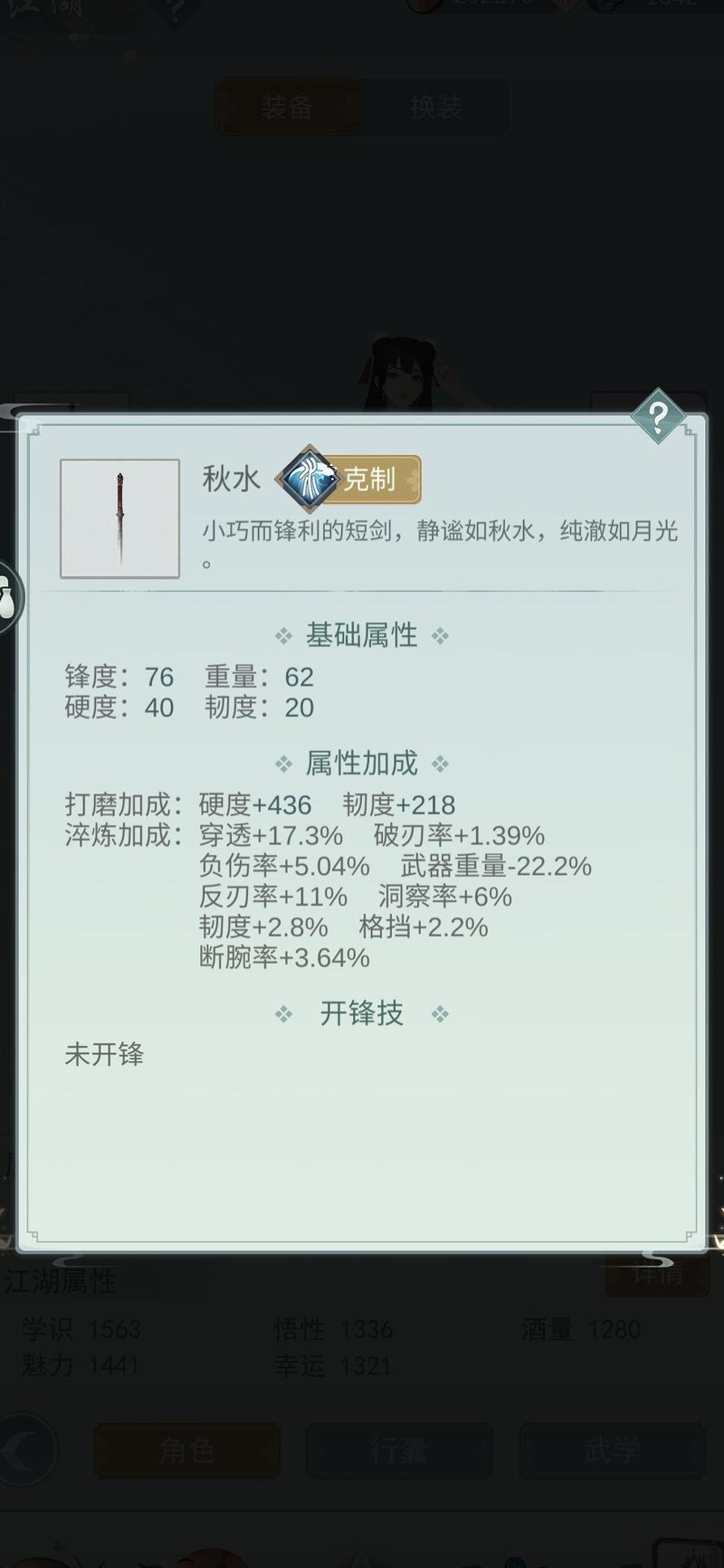 关于武器重量,界面虽不显示小数点,但实际计算包含小数部分。据其他玩家反馈,系统会精确运算。以我的武器为例,属性计算值约为62.24。因此,只要目标武器重量低于此数值,即可确保生效。