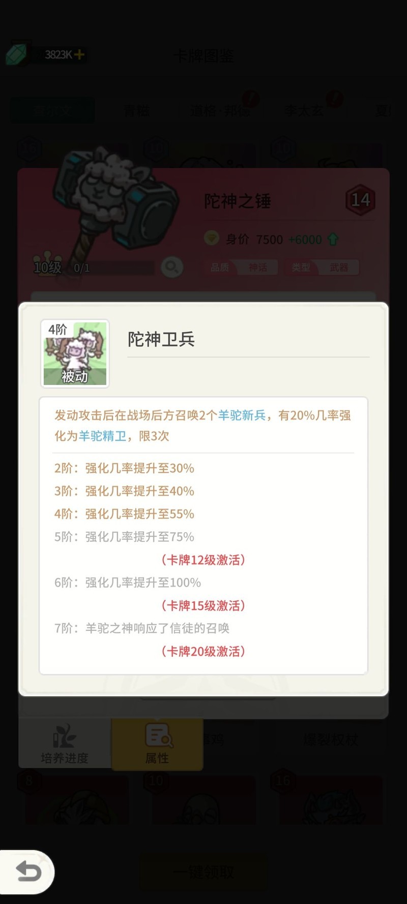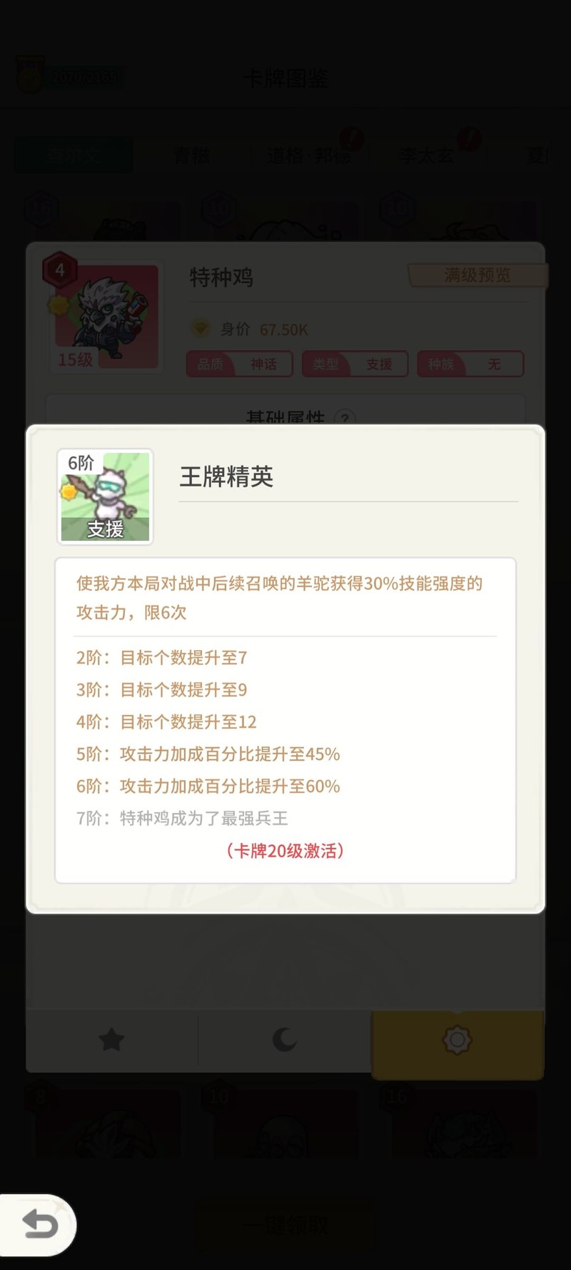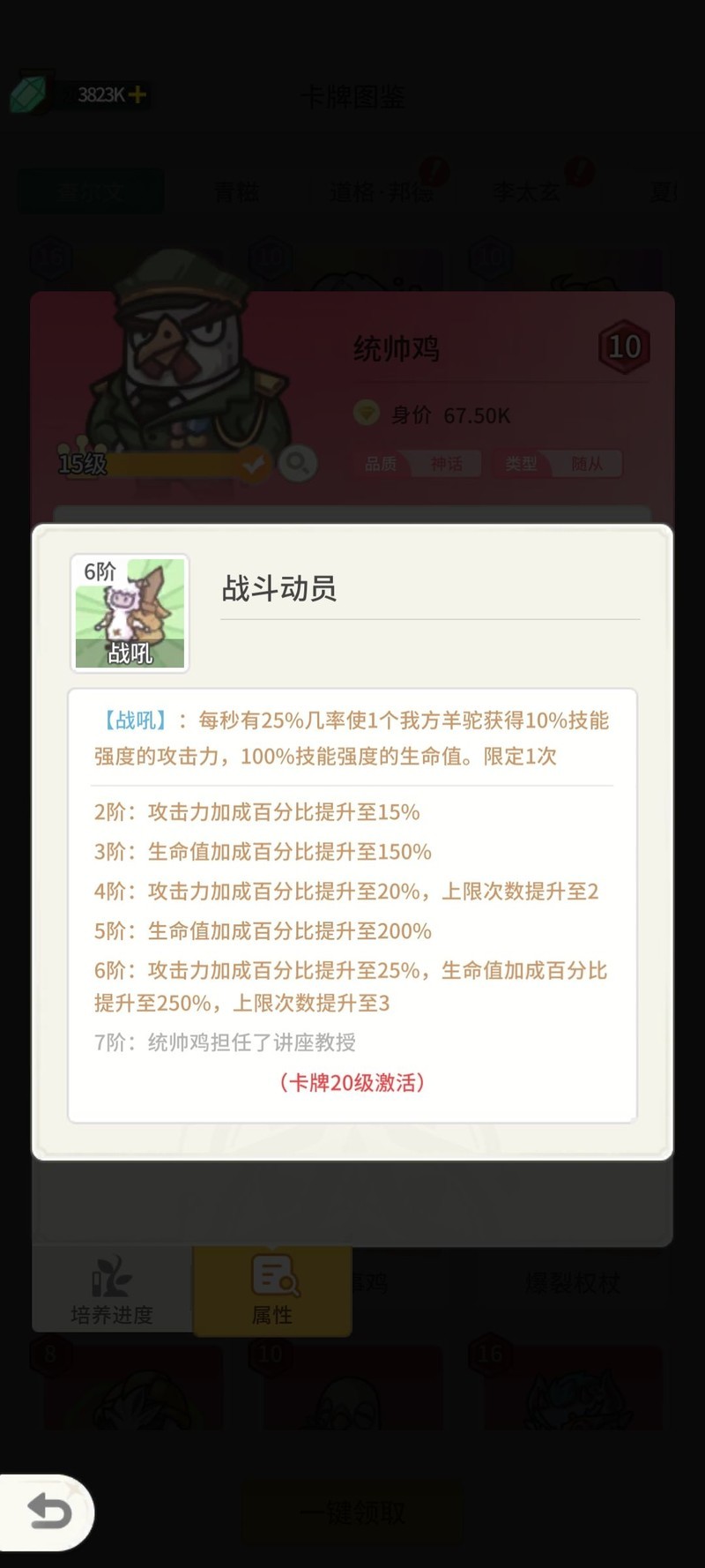 统帅鸡:为神兽提供攻击力和生命值加成。之所以叫鸡,是因为原本技能是召唤小鸡,后来才改为召唤神兽。