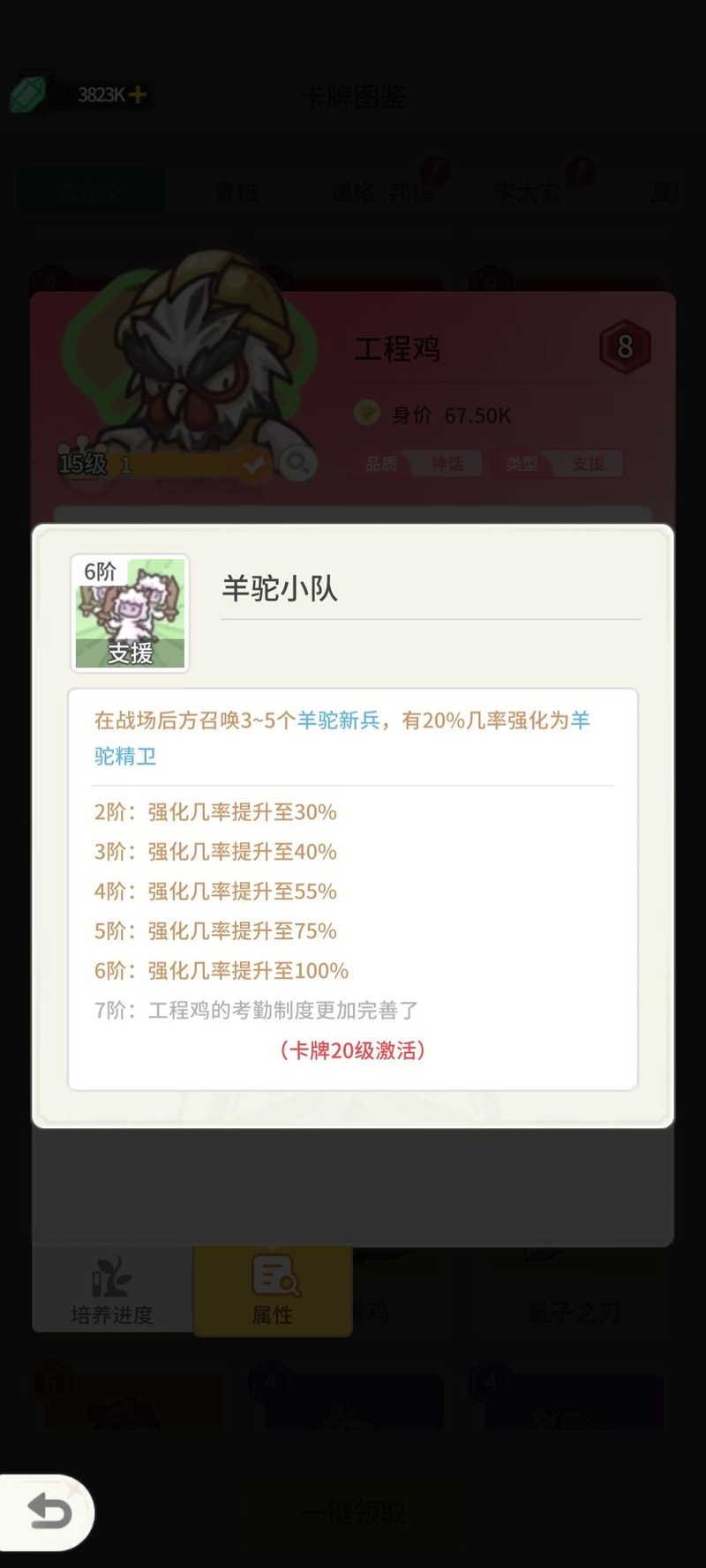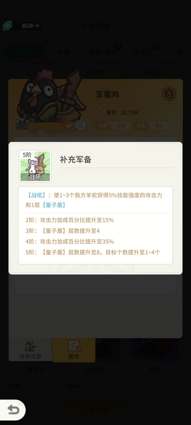 量子盾指挥鸡,搭配后勤鸡减肥,前期最佳替代蝙蝠随从,属性基础优秀。