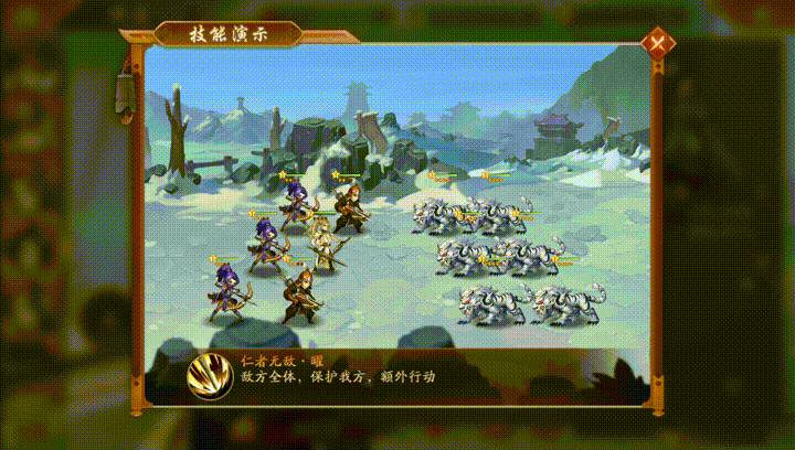 当相邻武将存活数量达到指定数目时,免疫伤害限制效果,并对属性减益具备一定抗性。每回合所受伤害累计达标后,获得持续1回合的状态。每回合开始时,随机为一名相邻武将提供额外护盾并附加,持续1回合。相邻武将在行动时,可提升我方全体攻击力与防御力,增强团队作战能力。