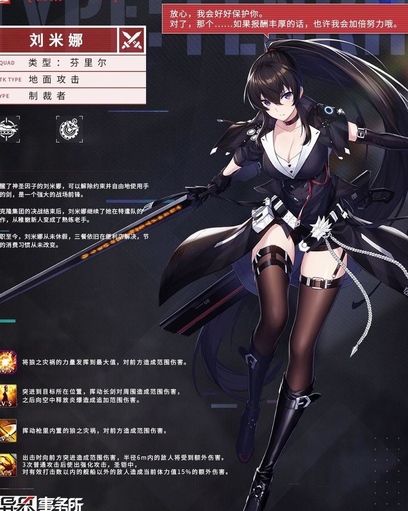 进场时触发战吼并向前滑行,对路径上的敌人造成击飞效果(无法影响空中单位),随后再次释放范围性战吼,可攻击到空中目标,被铲中的狙击角色极易瞬间阵亡。普通攻击三次后强化下一次普攻,伤害极高,并在PVP中附加自身15%最大生命值的额外伤害。