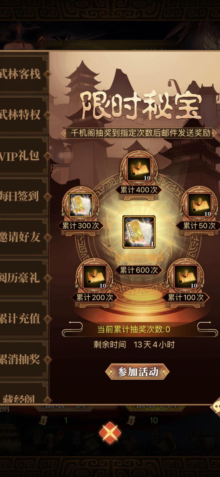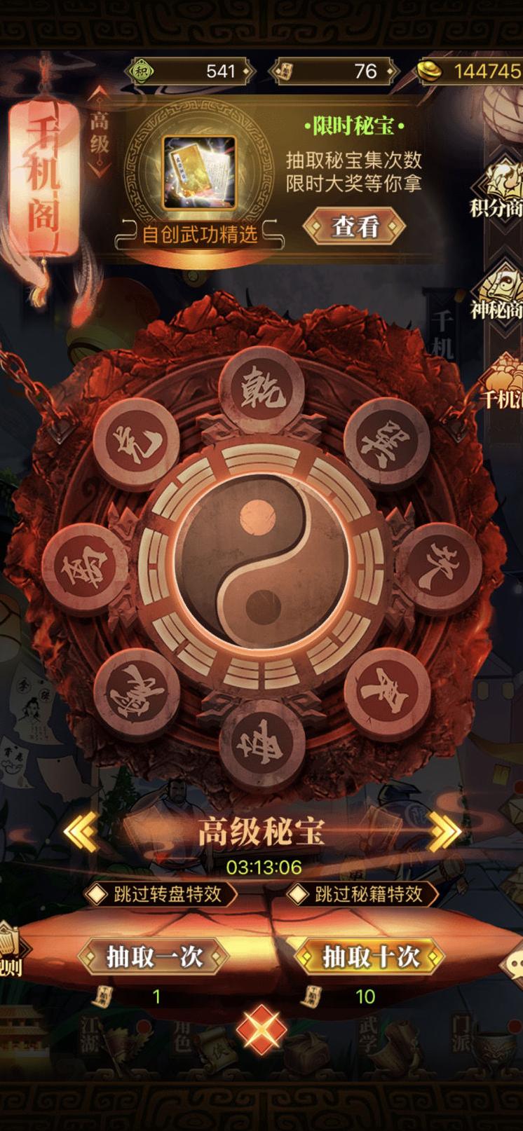 千机券是获取江湖武学的重要途径,每期限定任务不同,完成指定抽取条件即可获得相应等级的奖励。