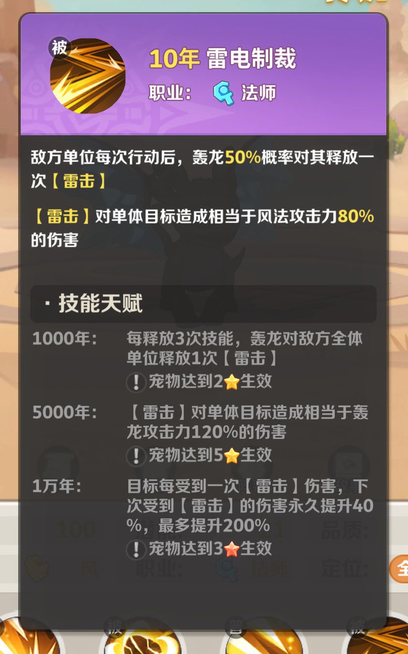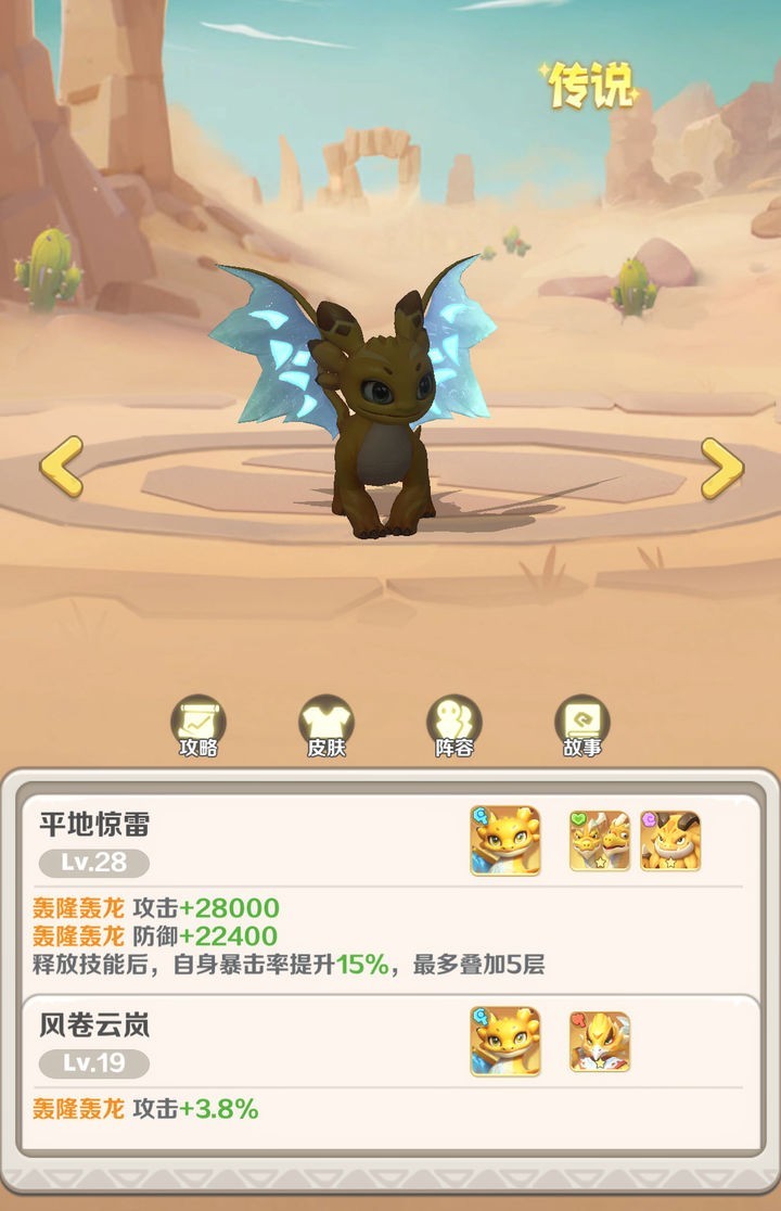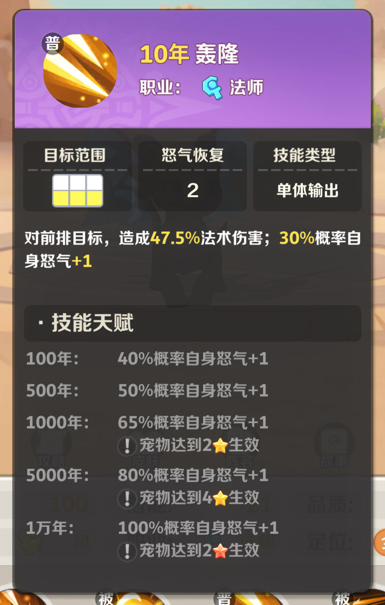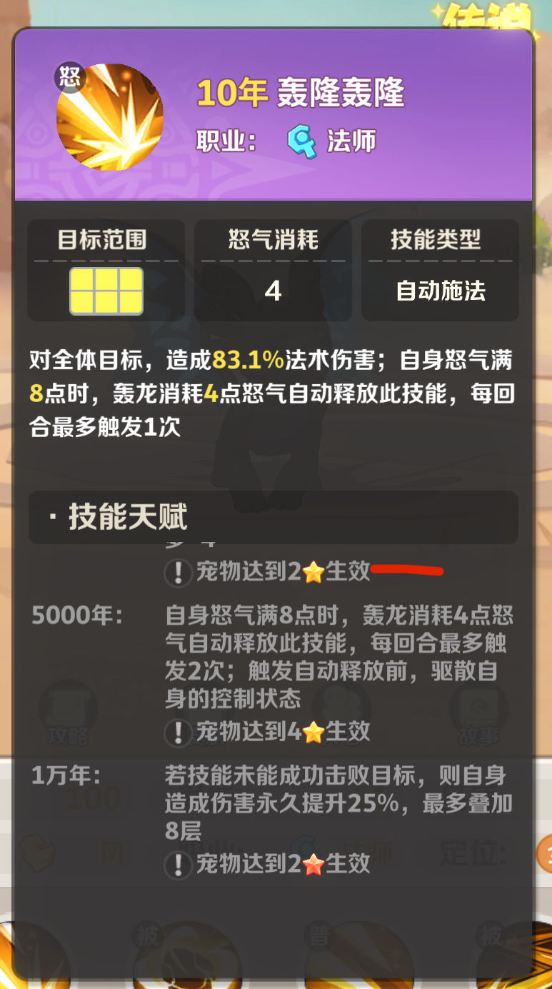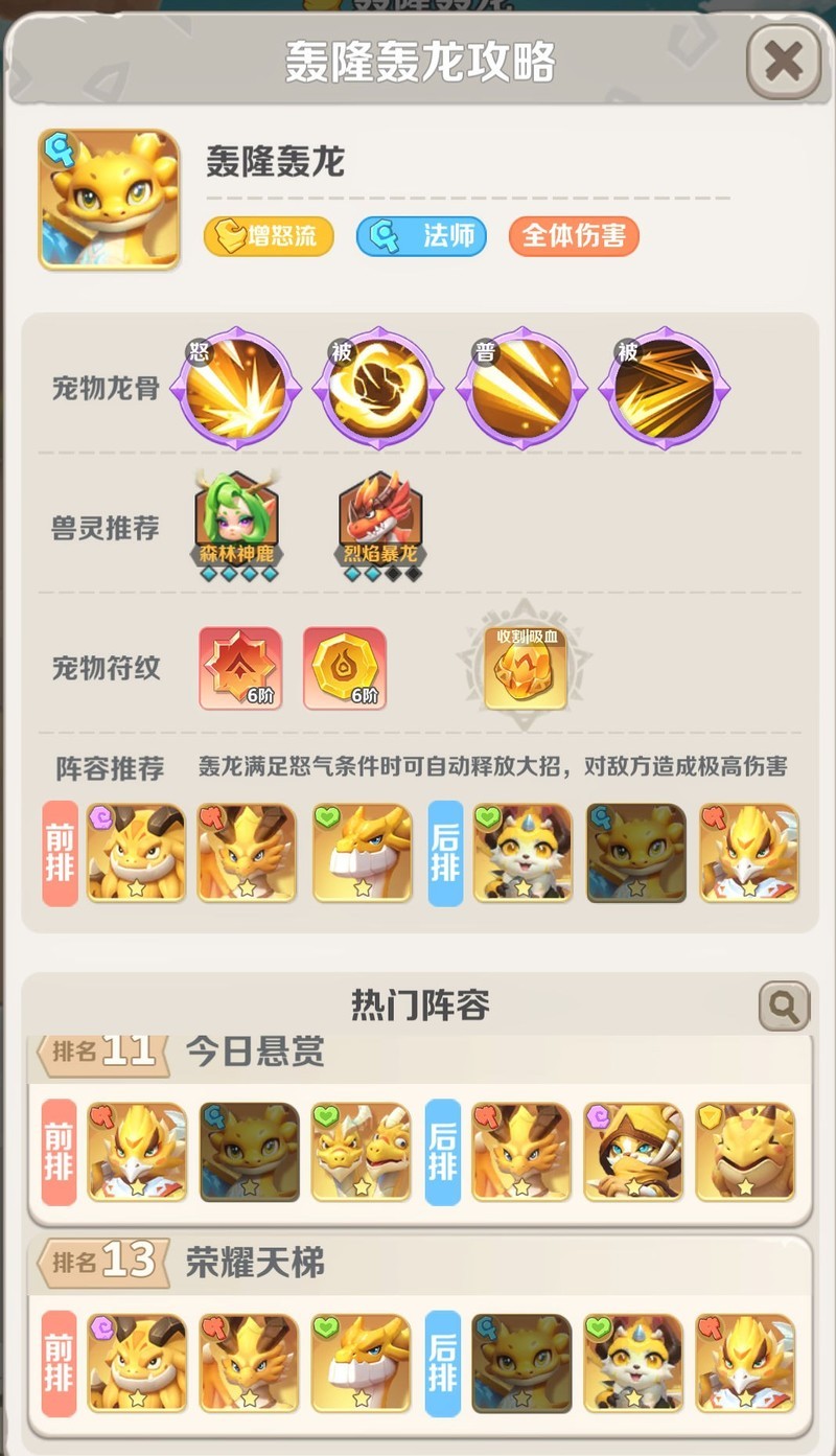 :作为风系新加入的法术输出角色,轰隆轰龙为风系阵容带来了全新的作战思路。在风系增怒流体系中,不仅轰龙自身具备怒气积累能力,还可与其他风系宠物如雷龙(双头龙)、游龙(气球龙)等形成协同效果,快速积攒怒气,从而最大化其群体技能轰隆轰隆的释放频率与输出伤害。尤其在红三阶之后,轰龙的爆发伤害表现更为突出。