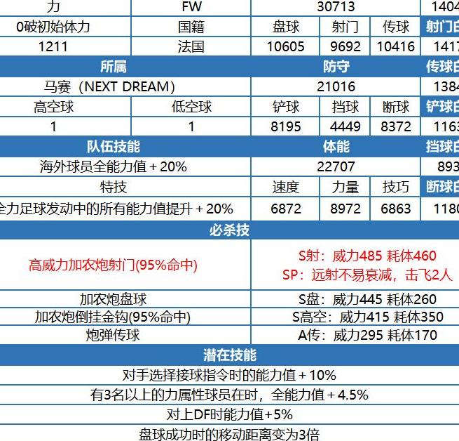 自带485远射时,其威力与荷兰哥相近,455撞墙效果也与盘球相当,但盘带表现更出色。进攻下限高于荷兰哥,但缺乏封堵技能,略显不足。不过其完全体可使用510射门,国服因超限皮肤提前上线,可搭配超月中岬与超限力皮,使超限力皮也能达成490S撞墙,显著提升强攻突破能力。