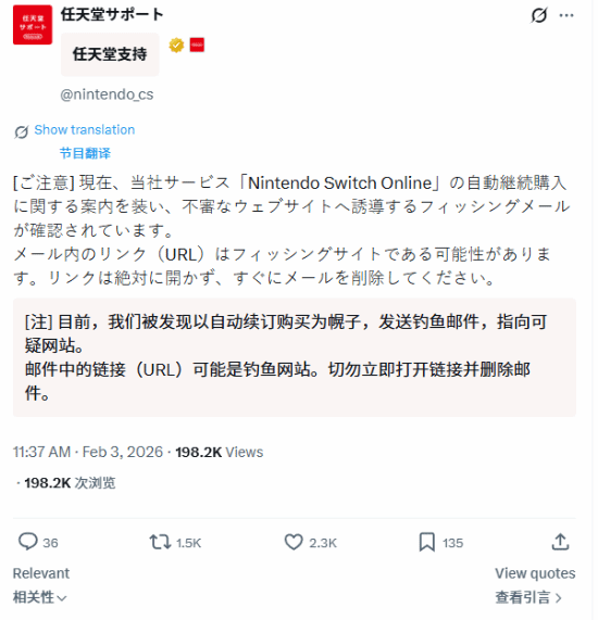 2026年2月3日,任天堂发布安全提示,指出近期出现一批仿冒Nintendo Switch Online自动续费通知的钓鱼邮件。这些邮件以续费提醒为名,诱导收件人点击内嵌的可疑链接,进而访问伪造网站,存在窃取账号凭证、泄露个人信息及造成财产损失的风险。