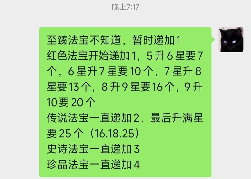 这里补充一张法宝升星所需数量的图表,数据为个人记录,仅供参考。