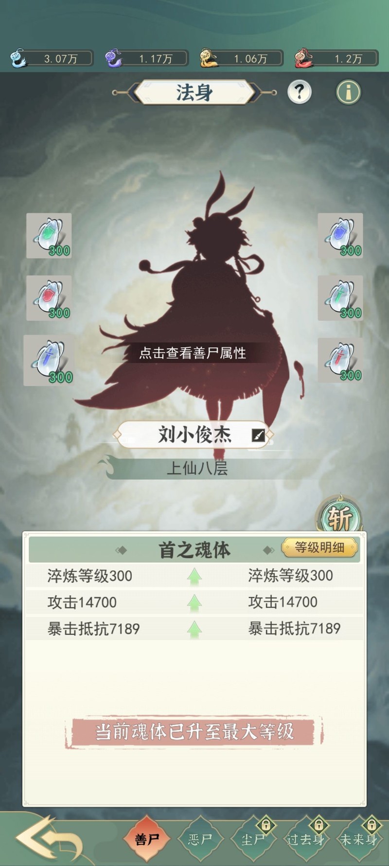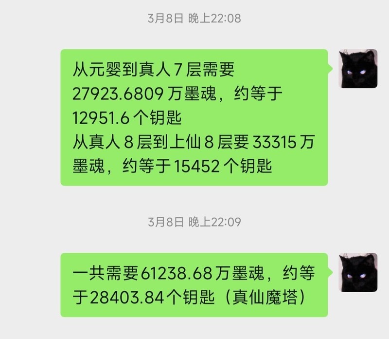 本体最高可升至仙阶八层,升级所需资源主要通过魔塔扫荡获取(建议先确保能通关九十九层后再开启倍率扫荡)。升级法身需要约六亿一千二百三十八万六千八百个墨魂,而扫塔所得的墨魂数量远低于墨玉和墨魄,因此墨魂往往成为瓶颈。相比之下,其他资源通常会有盈余。若想快速提升法身与善尸,建议每天在坊市买满魔塔钥匙。目前我每天购买魔塔钥匙需花费约一亿六千万灵石,还请根据自身情况合理安排,若灵石不足,可暂缓购买。