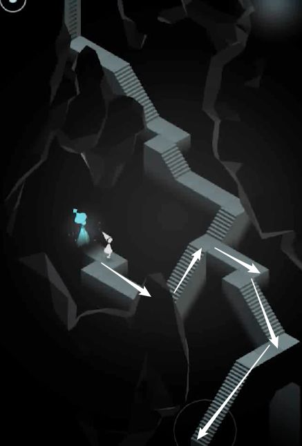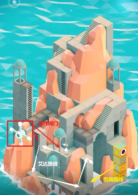 抵达高处采集花朵后,沿指定路径下行。拉动阀门操控机关,升起平台,引导艾达登上楼梯并触发开关。启动后让艾达离开当前平台,旋转阀门将带楼梯的平台完全抬升,待艾达进入后再顺阶梯下行。再次转动同一阀门,使前方阶梯下降,艾达走过刚才下来的台阶。继续旋转阀门,放下其面前的阶梯,使其踏上台阶。随后移动图腾至指定位置,艾达站上图腾,由图腾承载前行,最终抵达大门。
