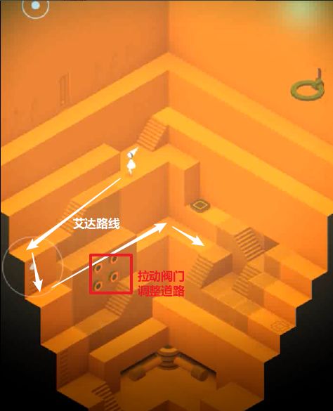 拉动拉环机关并沿其路径前行,通过操控机关改变艾达前方的路线。到达旋转阀门处,调节道路使艾达能够站上机关平台。再次旋转阀门,调整通路,让她顺利下行,随后沿着楼梯向下攀爬,继续前进。