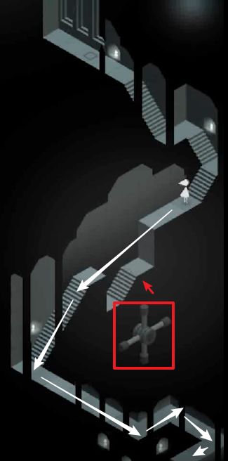逆时针转动阀门打开通路,艾达踏上可旋转的台阶。随后将阀门顺时针转半圈,使其进入大门。走出门口后再次顺时针旋转阀门半圈,另一侧的门随之开启。离开出口后,继续顺时针转动阀门半圈,前方出现一个按钮。艾达踩下按钮,触发机关,新的大门显现,随即步入其中。