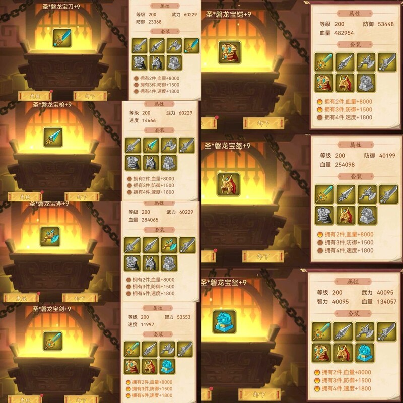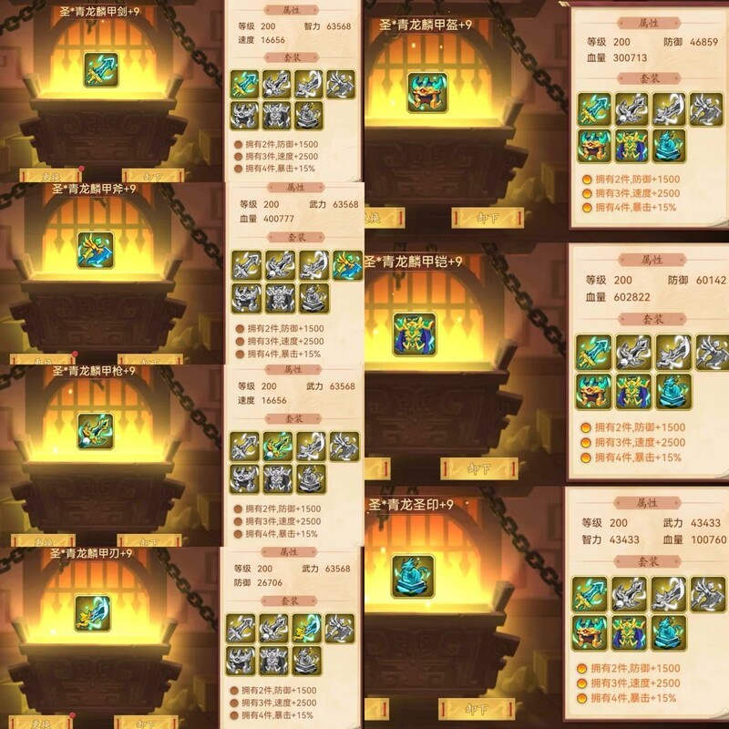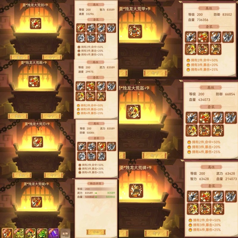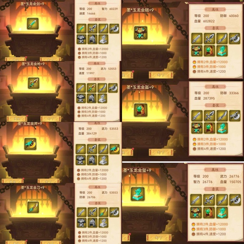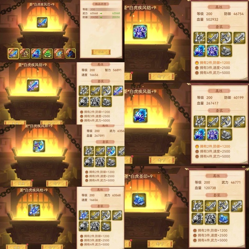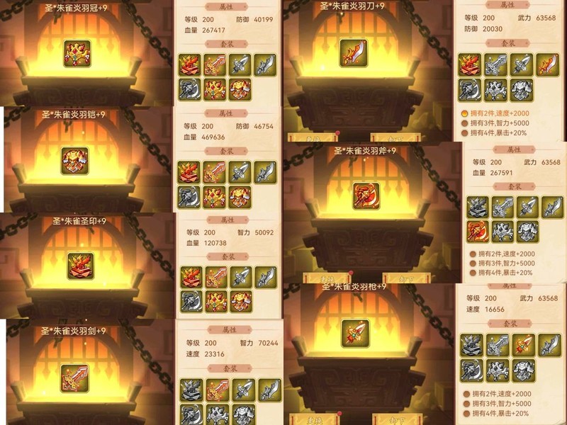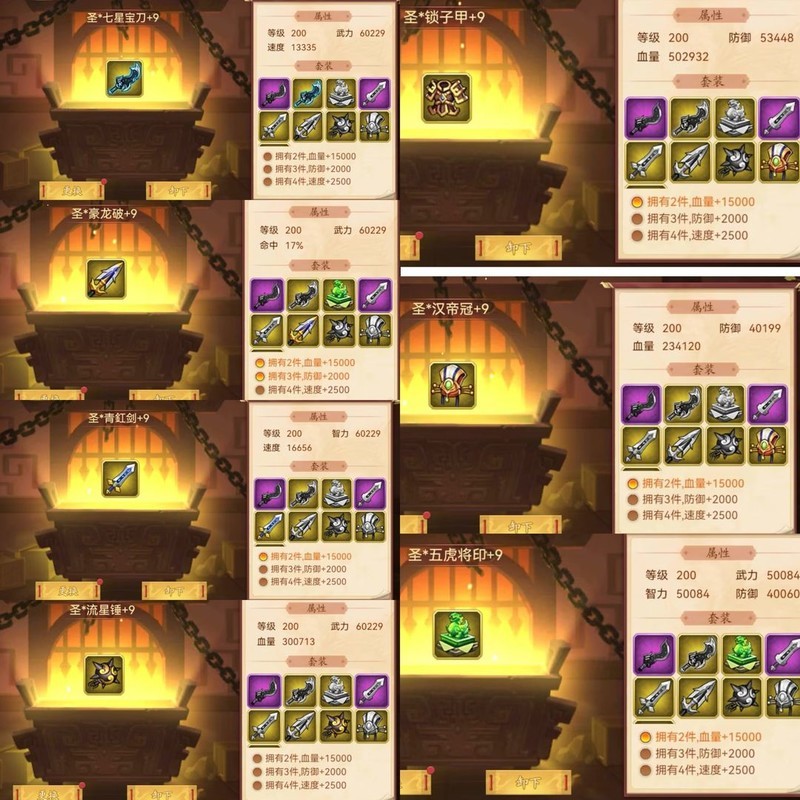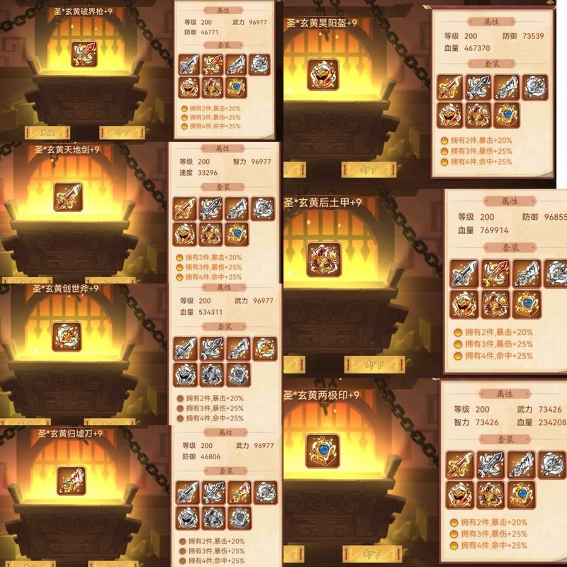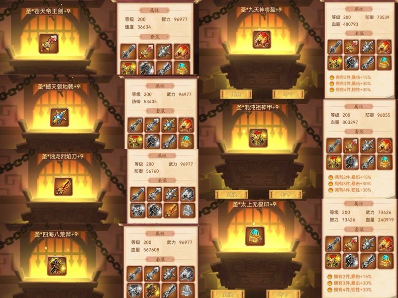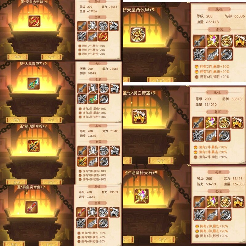 装备属性均为200级神圣+9属性。