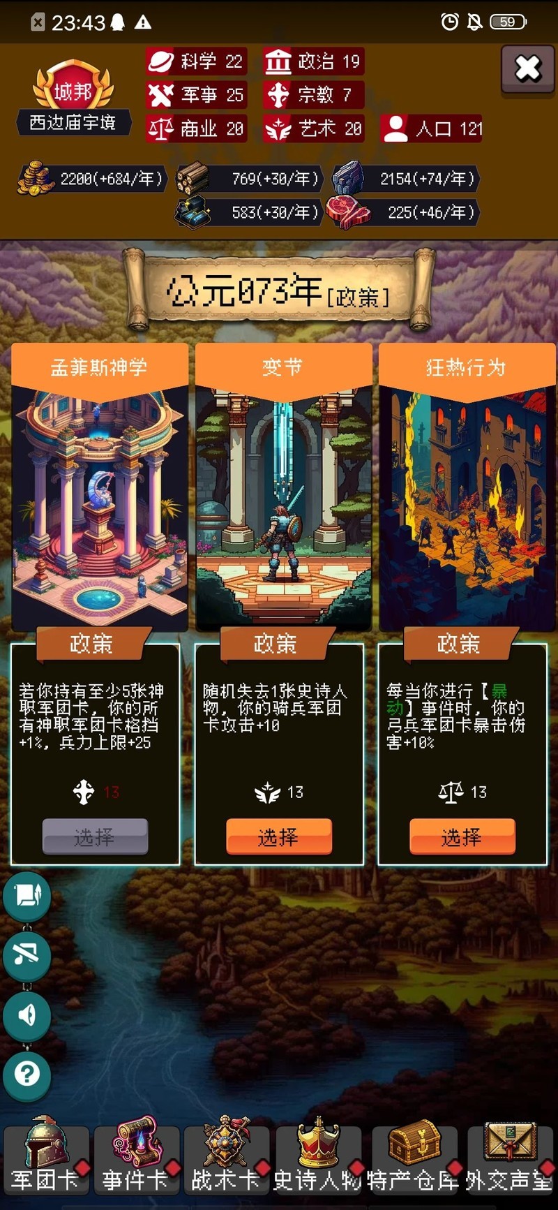 宗教可培养,尝试使用神圣战术卡,若运气好可通过祭天获得强大助力,后期实力逆天。但培养宗教可能导致属性偏向,军事难以达到61,遭遇征服时无法解锁,其他属性也受影响,可能错失部分必选政策。