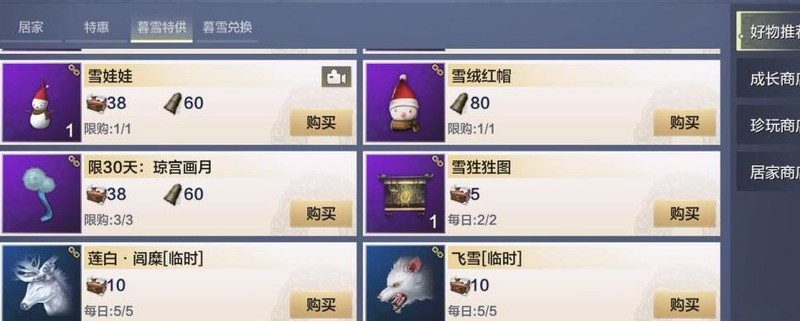 暮雪商店除可兑换雪娃娃外,还提供雪绒红帽等限定时装,以及玉方桌、流翠烛台等专属物品。