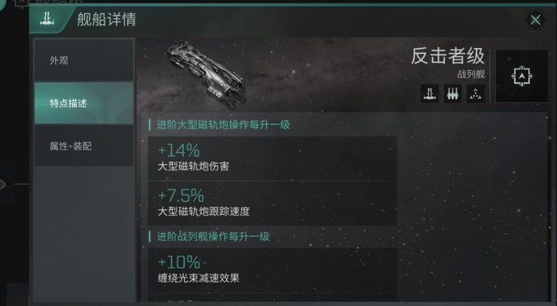反击者级是天蛇集团的战列舰,具备846槽位,技能为每提升一级进阶大型磁轨炮操作。