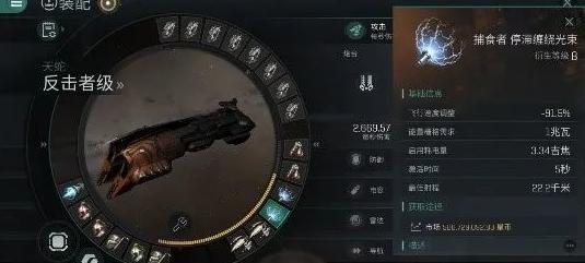 反击者级的缠绕光束性能卓越,配合捕食者网在满船体状态下,最佳射程可达22.2公里,飞行速度调节更是独特地达到-91.5%,表现极为出色。