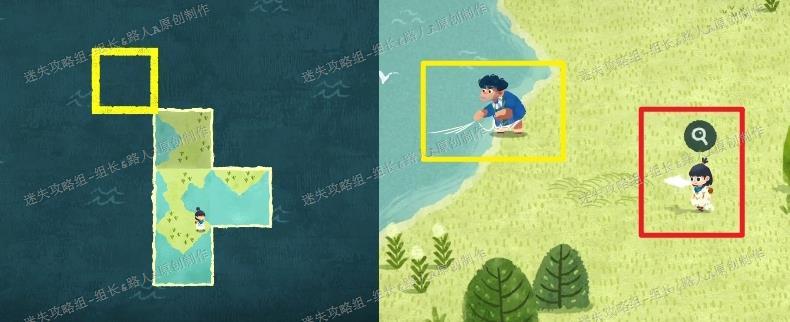 拼接完成后前往未探索区域,红框处可拾取地图碎片,黄框处与大叔对话触发剧情。