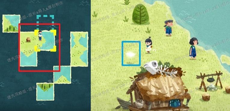 将图中红框内的地形拼合,即可显现海边小屋(其余部件无需完全组装),靠近可触发剧情,同时在蓝框位置获得新碎片。