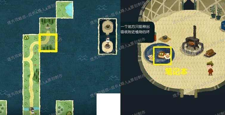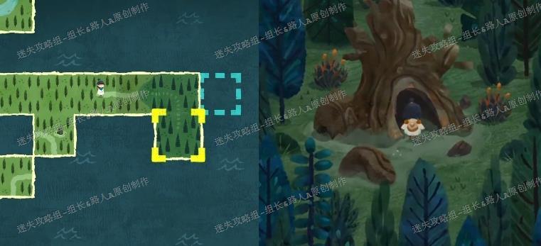 迷雾森林前两阶段未用的区块,结合小飞机信获得的碎片,可拼成新路径,生成一棵树,进入其树洞。