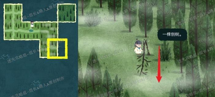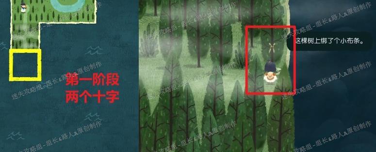 第二阶段需根据地面枯树判断行进方向。所示,枯树倒伏的方向即为前进路线,另一区域也应朝此方向放置。