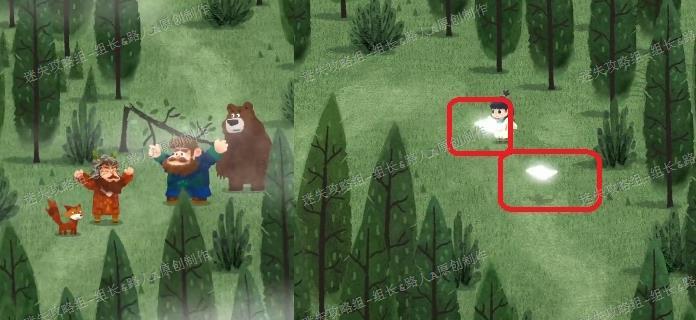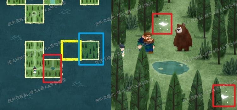 第一阶段结束后会进入过渡环节,图中红框与蓝框区域均属于前一阶段的范围。蓝框区域后期才会使用,当前应先连接红框区域并前往,途中将遇见棕熊大叔,触发对话剧情并获得两块碎片,这两块碎片用于开启第二阶段的迷雾森林,拾取后即可正式进入下一阶段。