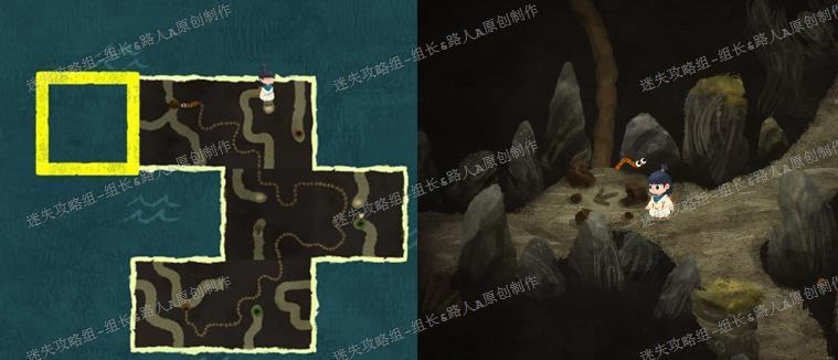 进入第二个树洞后,先将地图拼成指定形状,再由专家清理土块。