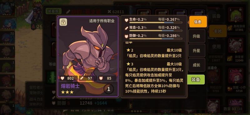 如果选择常规出站宠物为熔岩龙,建议搭配熔岩骑士卡,走团队暴力输出路线。可提升0.3暴击率、0.3爆伤、0.24攻击力和0.3攻速,推荐使用残酷天使四件套。