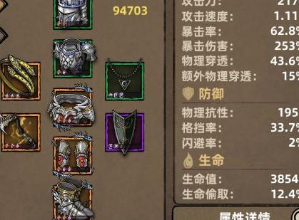 武器推荐单手搭配副手,副手优先选择增加物理抗性。其他部位属性优先级为:50%穿透最佳,其次为暴击、爆伤、攻击力、10%以上吸血、格挡;生存方面,生命值为首,其次物抗与元素抗性。若长时间未获得理想装备,可考虑花费少量金币在商店购买或前往铁匠铺进行洗练提升。