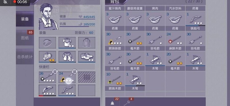 木弩可穿戴,箭矢置于弩上,不占背包空间。上述物品共用八个格子,余下两个可自行选择携带物品。