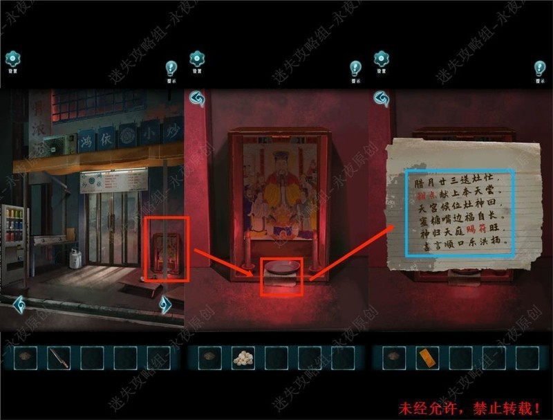 在此处调查,留意红色线索,得知给灶王爷甜食可获得符咒。