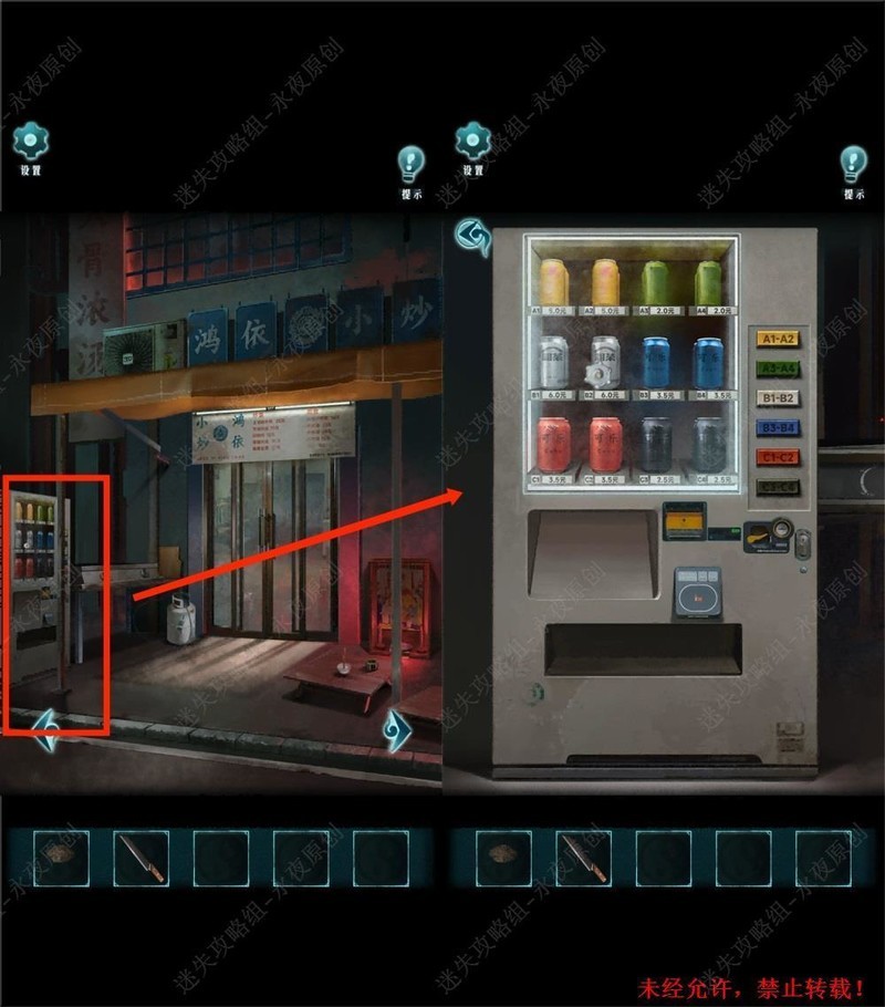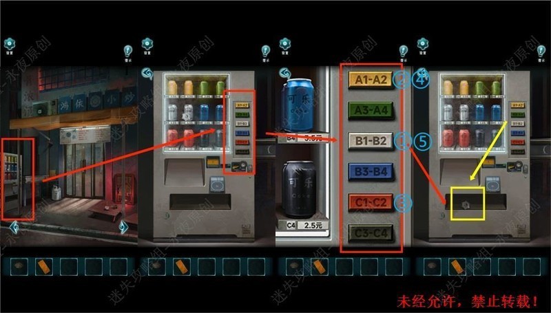 在此处展开调查,操作自助售货机,依照先前获取的颜色顺序线索,依次按下白色、黄色、红色、黄色、白色按钮,获取。