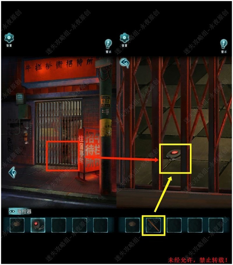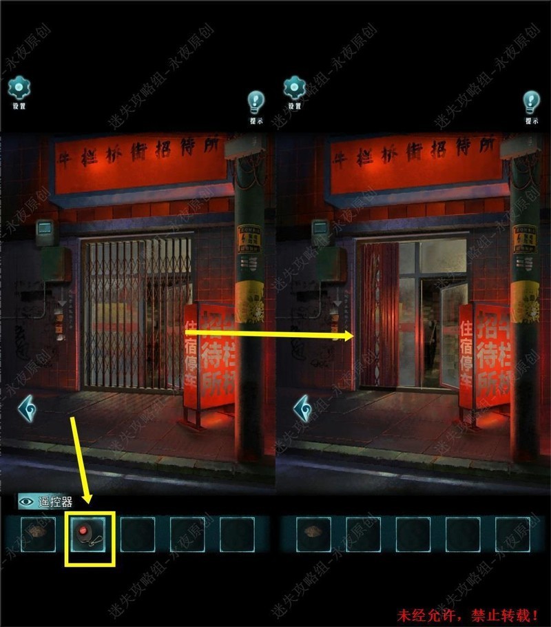 点击物品栏中的,随后点击招待所大门,按下遥控器按钮即可解锁。